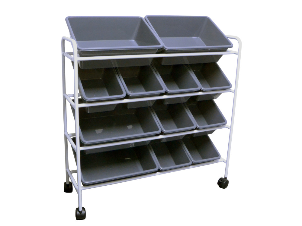 Praktisk förvaringsvagn med metallramer och 12 st plastlådor för att enklare se och förvara mindre saker.
